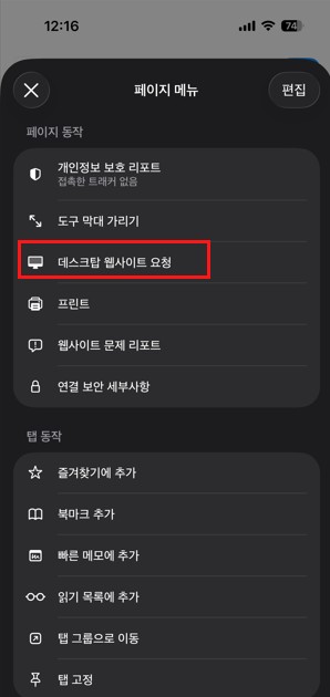 - **[데스크탑 웹사이트 요청]**을 클릭하세요. 화면이 PC 버전처럼 바뀝니다.